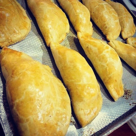 7)After you have completely filled the pastry, set on a baking tray, egg wash the top and pinch with a fork